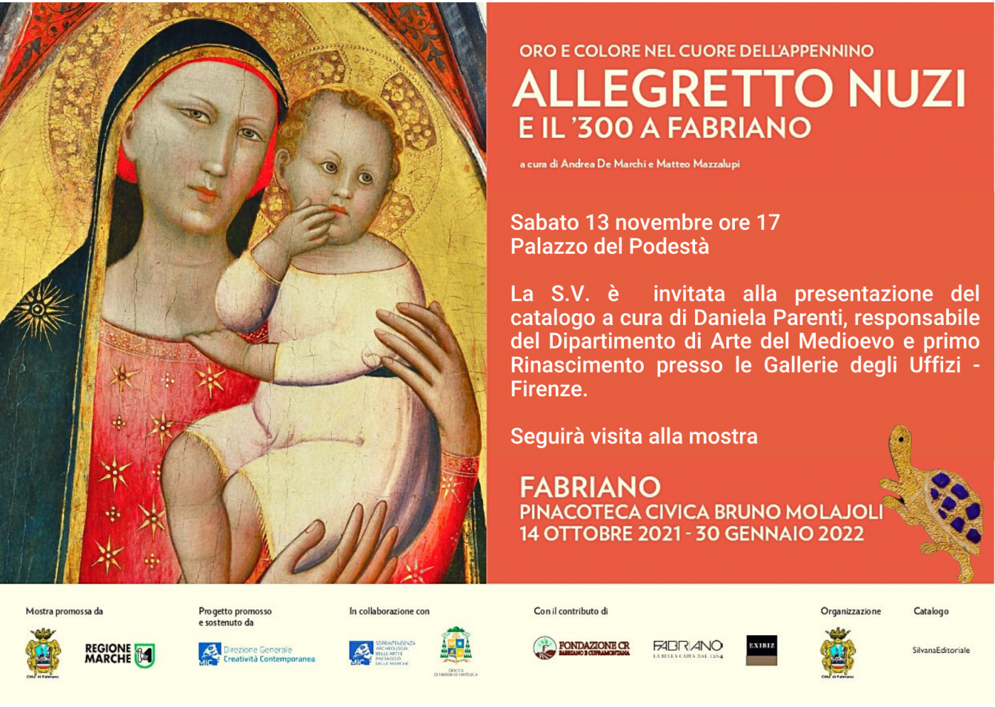 Si comunica che sabato 13 novembre 2021 alle h.17.00 presso la Sala consiliare del Palazzo del Podestà (ingresso da Largo Bartolo da Sassoferrato), avrà luogo la presentazione del catalogo della Mostra "ORO E COLORE NEL CUORE DELL'APPENNINO. ALLEGRETTO NUZI E IL '300 A FABRIANO".