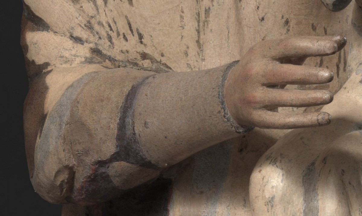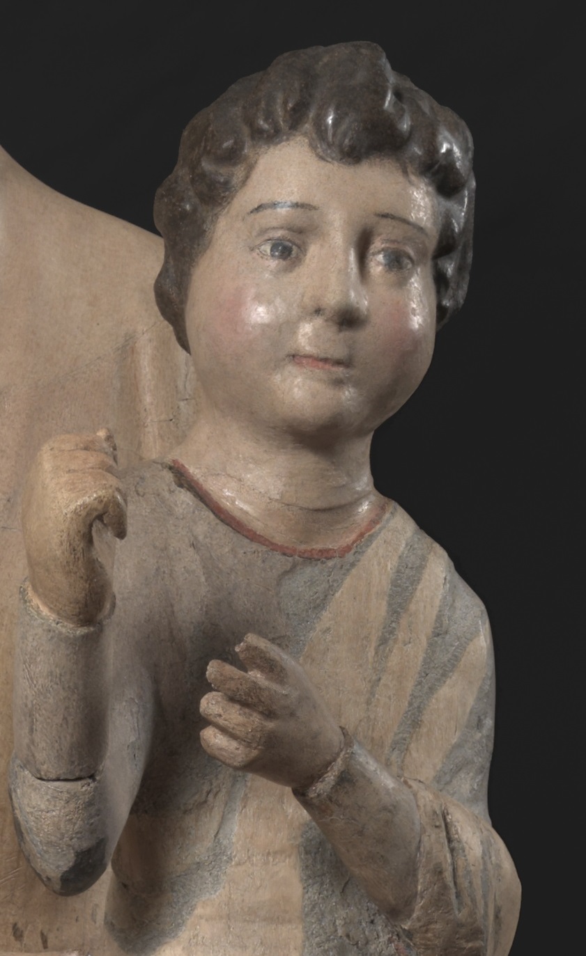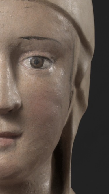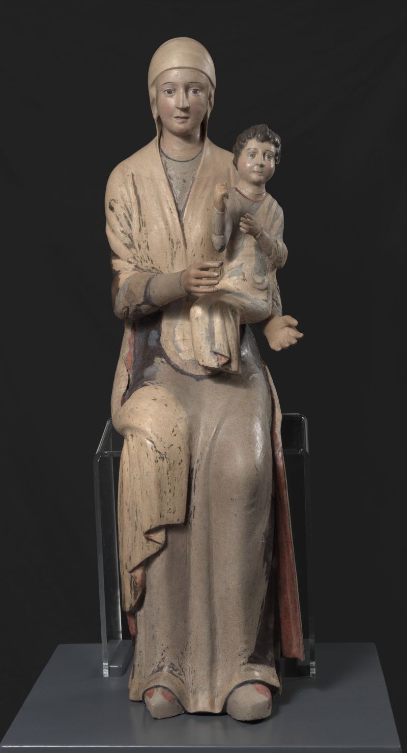 Ritrovata all’interno del Brefotrofio nello Spedale del Buon Gesù, la statua lignea si presentava con pesanti rifacimenti sia del modellato sia del trattamento della superficie. Dopo un complesso restauro è tornata visibile l’alta qualità dello strato pittorico originale, di cui purtroppo rimangono pochi lacerti policromi, visibili nella veste purpurea, con l’elegante decorazione a motivi geometrici, e nel manto rosso con rifinitura nera. Scolpita in un unico blocco cavo di pioppo e chiusa sul retro da un coperchio, la postura di Maria è frontale, mentre la posizione inclinata del Bambino, di certo successiva, non è proporzionata allo spazio sotteso delle mani della Vergine: questa, come altri esempi contemporanei, era seduta su un trono andato perduto. La concezione domestica che addolcisce le fisionomie e il trattamento pittorico del modellato la riconducono alla tradizione delle botteghe spoletine attive nella seconda metà del XIII secolo.