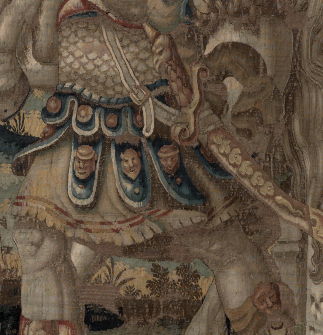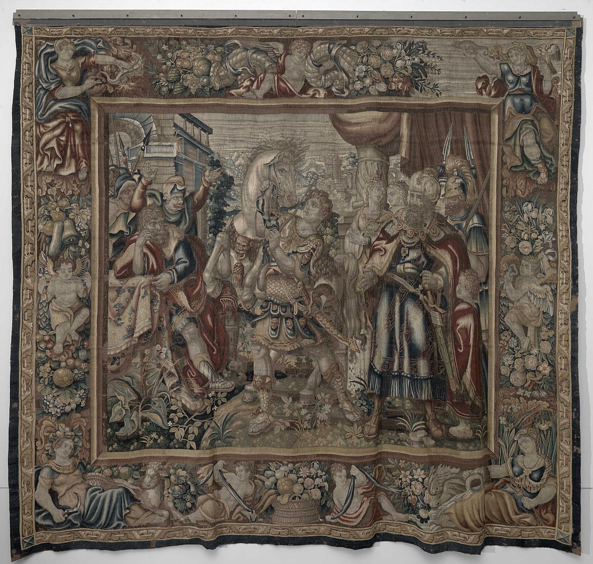 L'arazzo facente parte del ciclo delle Gesta di Alessandro Magno raffigura il giovane condottiero macedone mentre doma il suo destriero Bucefalo, alla presenza di Aristotele, del Re Filippo di Macedonia e della corte macedone. Il manufatto esalta la potenza di Alessandro, evoca le sue gesta e raffigura immagini scenograficamente ridondanti, secondo il gusto tipico dell'arte seicentesca, popolate da figure massicce al centro della scena, a discapito del decorativismo e dell'eleganza dei soggetti. I fregi rappresentano i quattro elementi della natura personificati da figure femminili.
