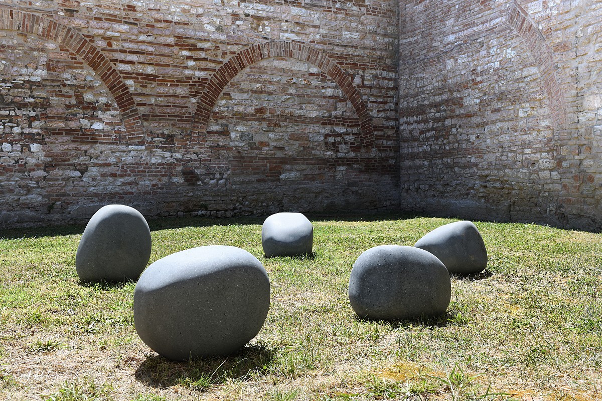 L’installazione è composta da cinque massi in pietra, semplicemente adagiati a terra. Quello che potrebbe sembrare un elemento naturale inserito nello spazio “artificiale” di un museo, è in realtà il risultato di un complesso processo creativo. Lo scultore ha inizialmente modellato in argilla una pietra “ideale”, levigandola fino a farla sembrare un sasso perfetto, come se fosse stato plasmato dall’acqua di un torrente. Da questa forma originale sono stati creati cinque esemplari in gesso, poi in cemento, e infine, grazie a una scansione 3D, sono stati scolpiti in pietra di Matraia, un materiale di color grigio-azzurro dall’eccezionale compattezza e resistenza. Pur avendo la stessa forma, i cinque massi appaiono diversi in quanto posti in cinque posizioni differenti, le uniche in cui stanno in equilibrio.