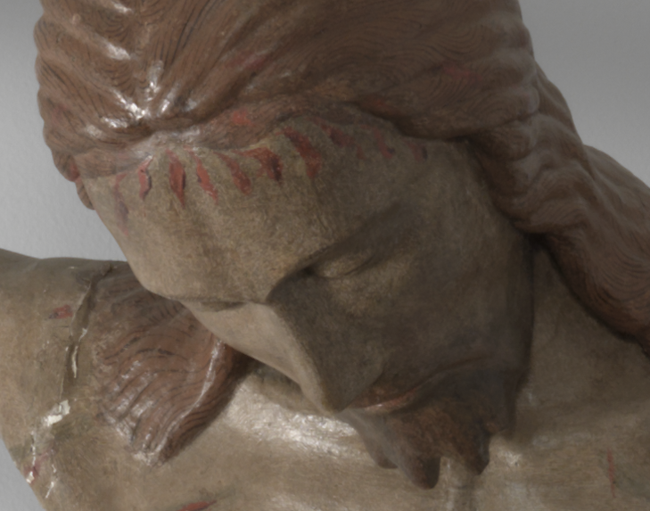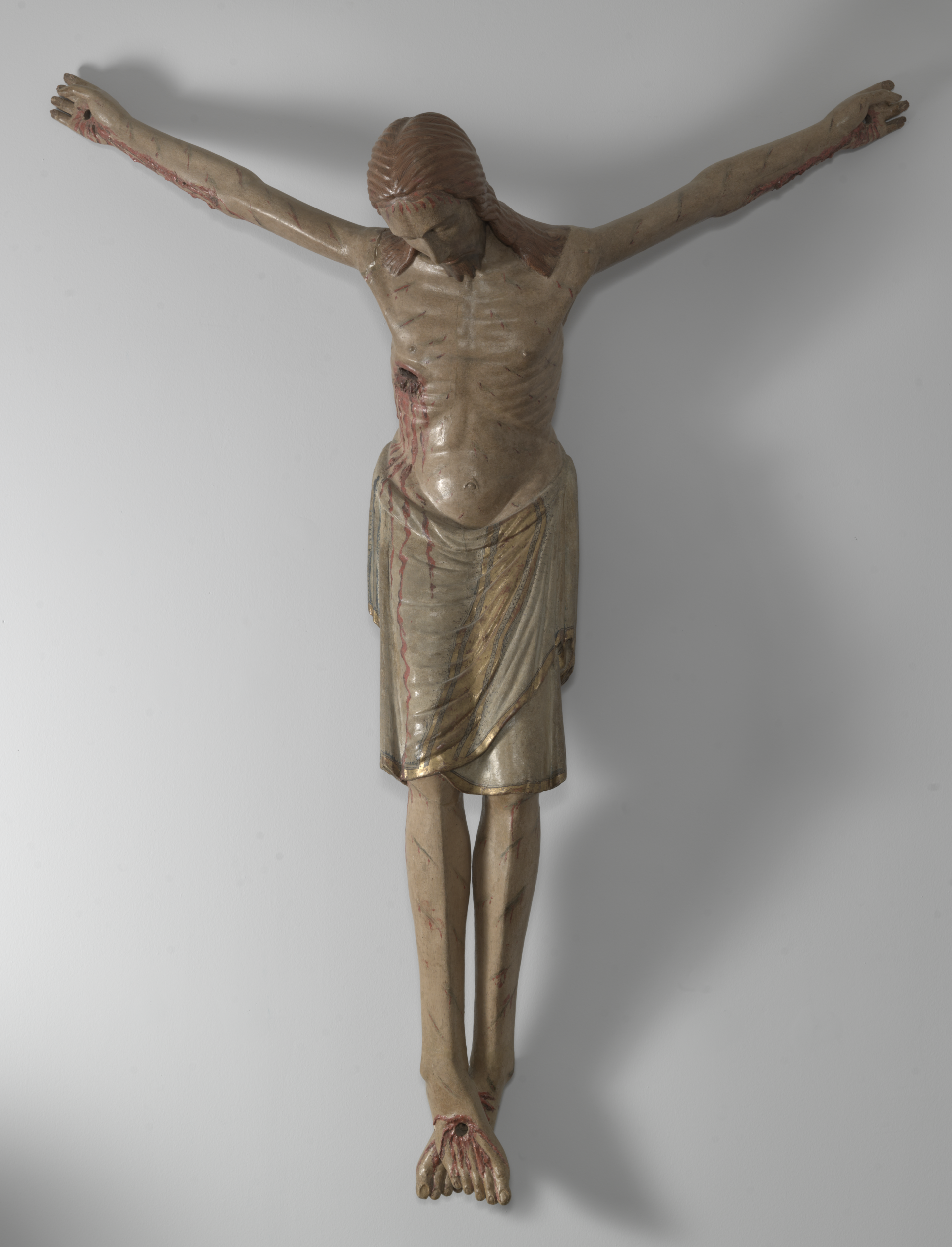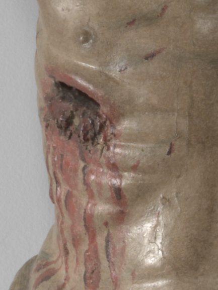 Il Cristo crocefisso, privo della croce lignea a cui in origine era appeso, è colto nell'attimo della morte. Colpisce l'acceso realismo fisico della rappresentazione che conferisce una intensa drammaticità alla morte del Redentore. Il corpo appare martoriato dalle sofferenze con una profonda ferita al costato, con il capo reclinato in avanti senza la corona di spine.