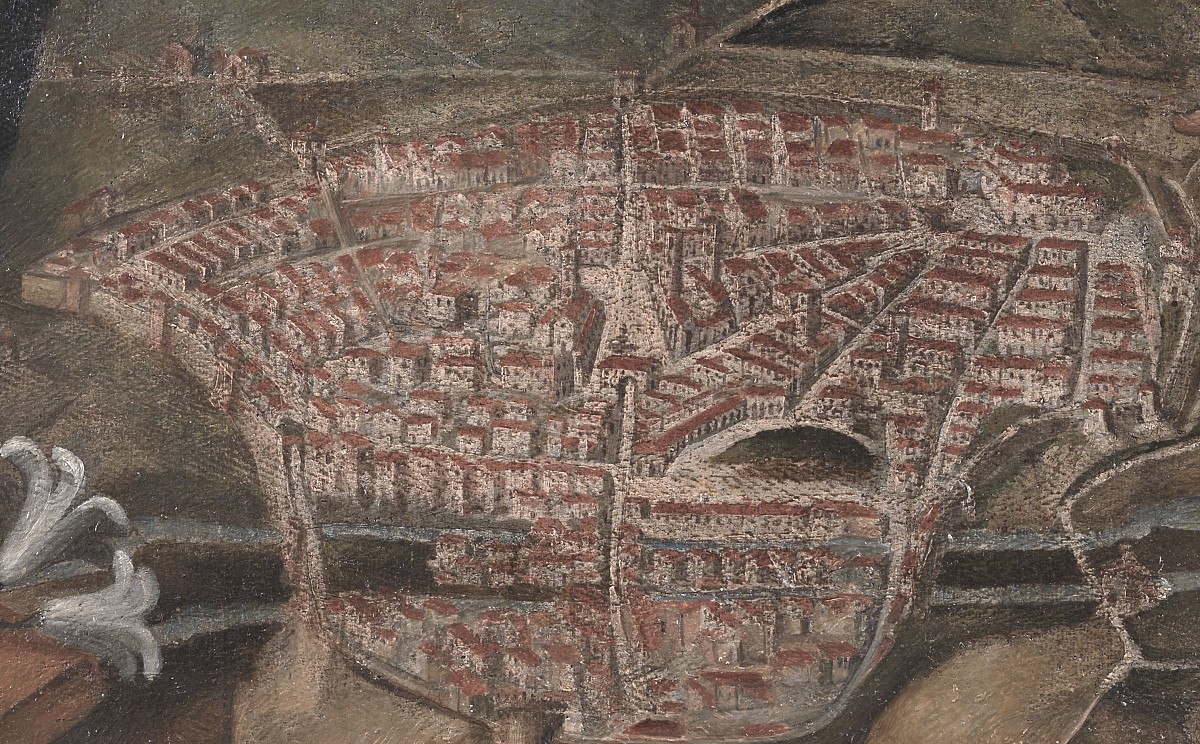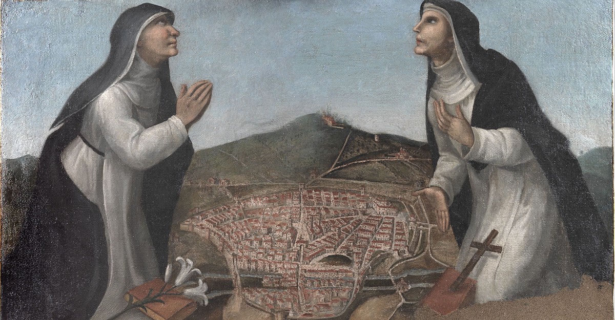 L'opera in questione proviene dalla chiesa di S. Domenico e raffigura le due beate, Bianca e Rufina mentre pregano per porre la città di Fabriano sotto la protezione della Vergine dell'Umiltà. Realizzata intorno alla metà del secolo, é un ex voto in memoria della storica vittoria conseguita nel 1519 dal capitano del popolo Giovanni Battista Zobicco ad Albacina contro l'esercito papale di Leone X che permise a Fabriano di conquistare la sua autonomia comunale. Il dipinto permette di conoscere le caratteristiche urbanistiche del tempo grazie ad un'originale e fedele rappresentazione topografica della pianta della città, incorniciata dalle due figure delle beate domenicane.