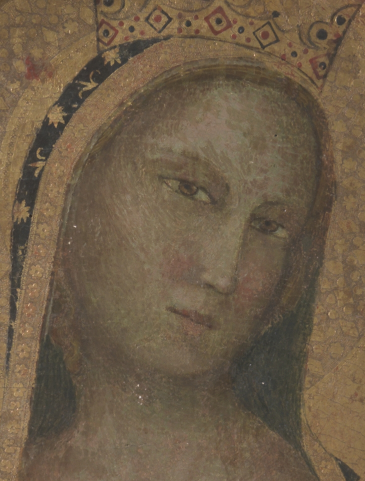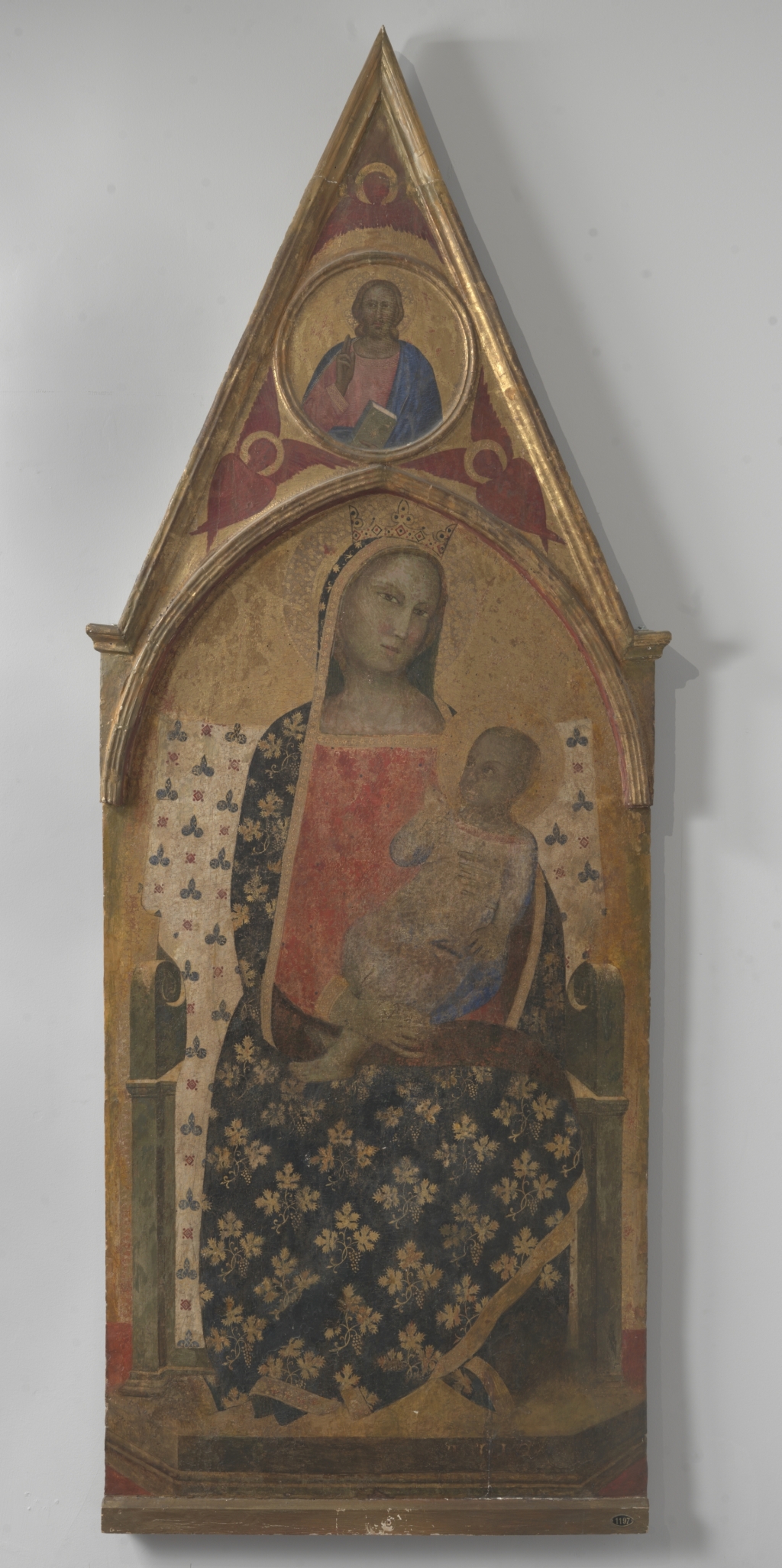 La Vergine, seduta su un trono, tiene sulle ginocchia il Bambino ed è rivestita di un ampio mantello decorato con ramoscelli di vite e grappoli d’uva dorati, simboli del sacrificio di Cristo. Alle sue spalle si stende un tendaggio bianco in cui compaiono decorazioni a forma di trifoglio, probabile allusione alla Trinità. Nella cuspide, Cristo benedicente è circondato da tre serafini. Malgrado la profonda svelatura della pellicola pittorica, la tavola è attribuibile con certezza alla mano di Allegretto Nuzi. L’esuberanza delle stoffe e i gesti meccanici dei personaggi tendono a collocare il soggetto nella tarda produzione del caposcuola fabrianese, quando più spinta si era fatta la sua vocazione decorativa.