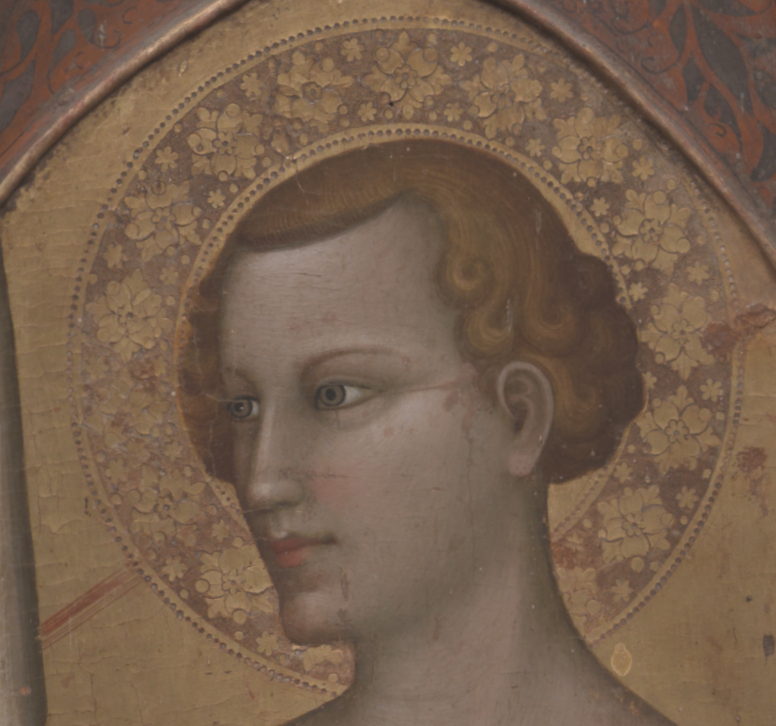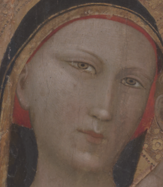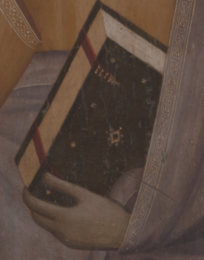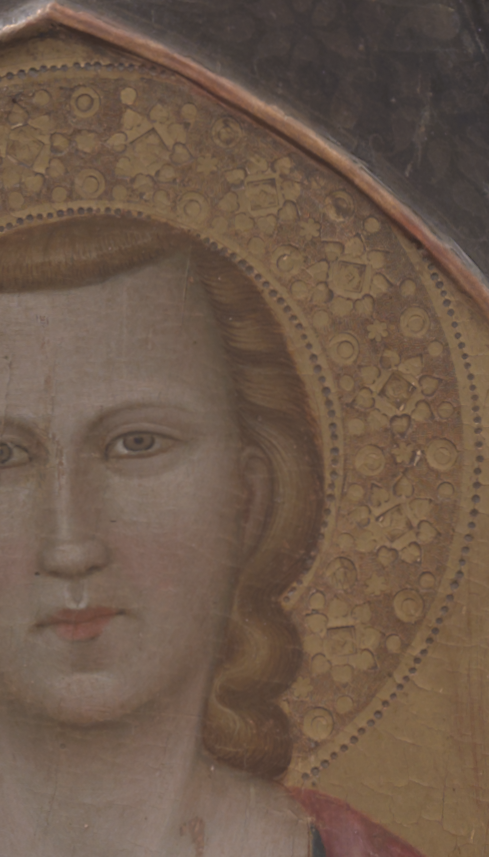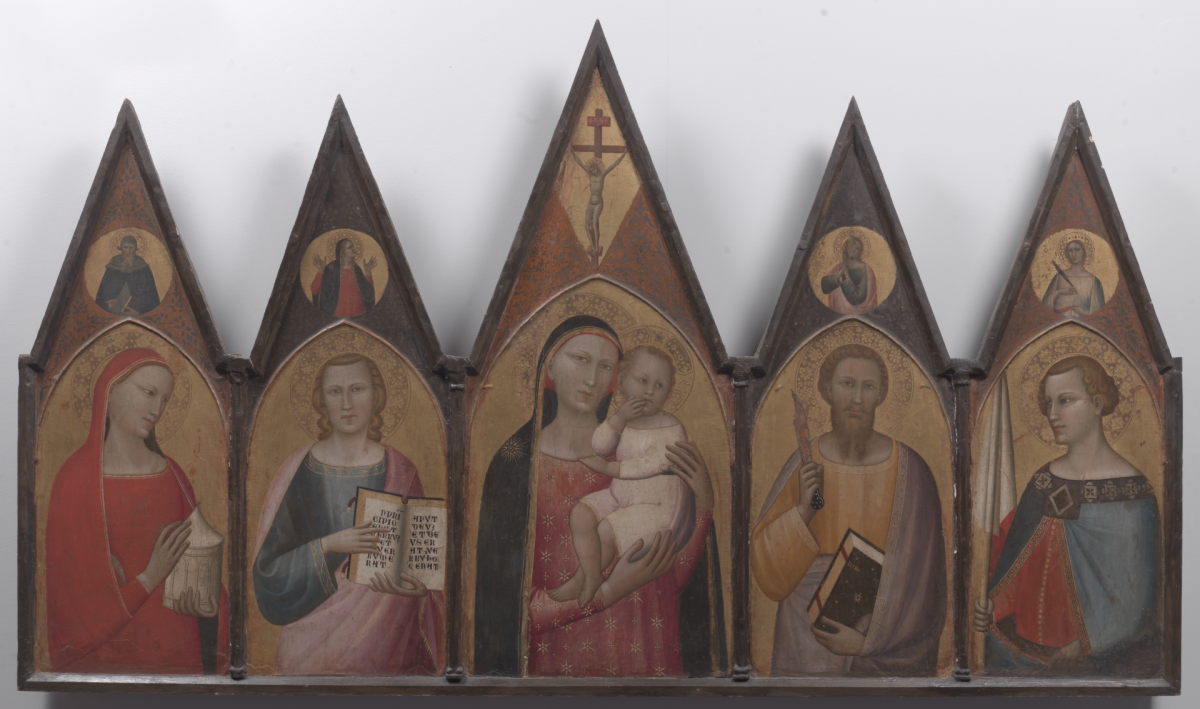Al centro, sul fondo dorato, la Vergine tiene sulle braccia il Bambino. Negli scomparti laterali, da sinistra: S. Maria Maddalena con il vaso d'unguento nelle mani; S Giovanni Evangelista con il libro aperto su cui sono scritte le parole iniziali del suo Vangelo; S. Bartolomeo tiene nella mano destra un coltello, simbolo del suo martirio; S. Venanzio con la bandiera bianca e rossa. Nella cuspide centrale è raffigurato il Crocefisso, nelle altre, da sinistra, S. Antonio Abate; la Vergine; S. Giovanni Evangelista; S. Caterina d'Alessandria.