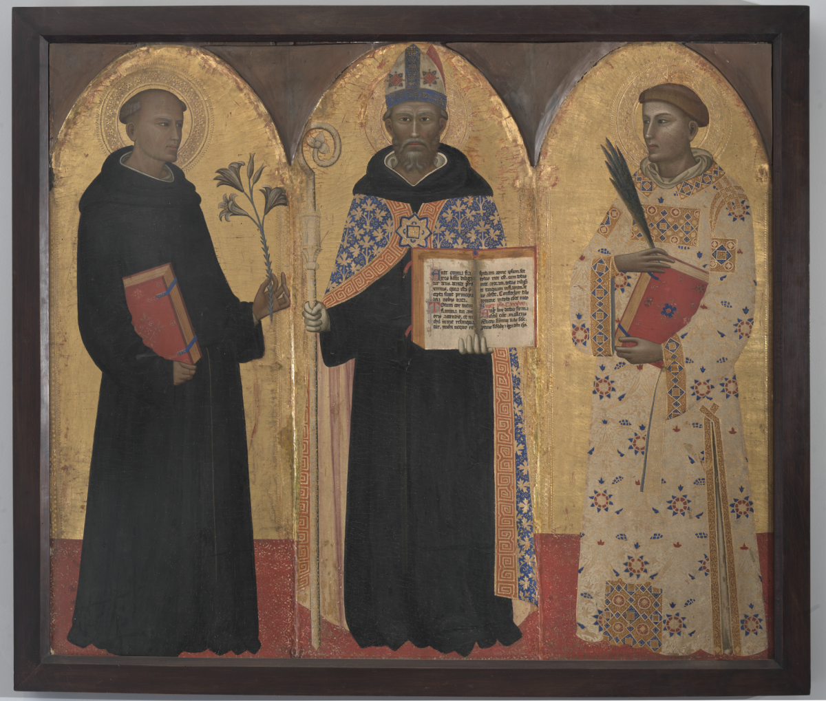 Recenti studi hanno dimostrato che l'opera in questione non fosse in origine un trittico, ma tre scomparti laterali di polittico rimontati in forma di trittico. I pannelli aventi la medesima grandezza raffigurano al centro S. Agostino che stringe nella mano destra il pastorale e sorregge nella sinistra il libro della sua Regola; ai lati, S. Nicola da Tolentino con in mano il giglio, simbolo di purezza e il libro delle Sacre Scritture e S. Stefano con indosso una preziosa veste diaconale arricchita da motivi ornamentali floreali, geometrici e animali, tra cui è possibile ammirare tartarughe ed uccelli.