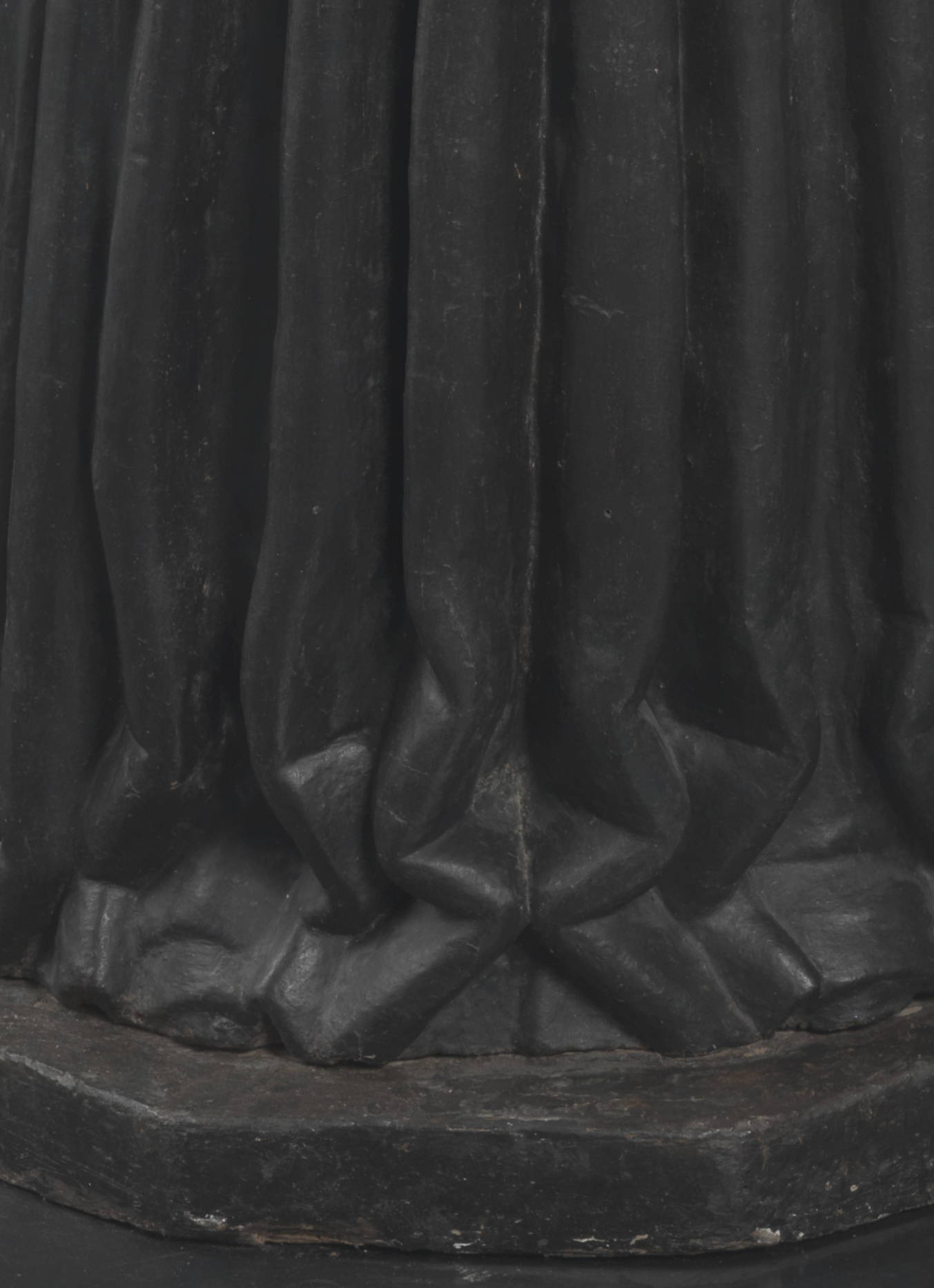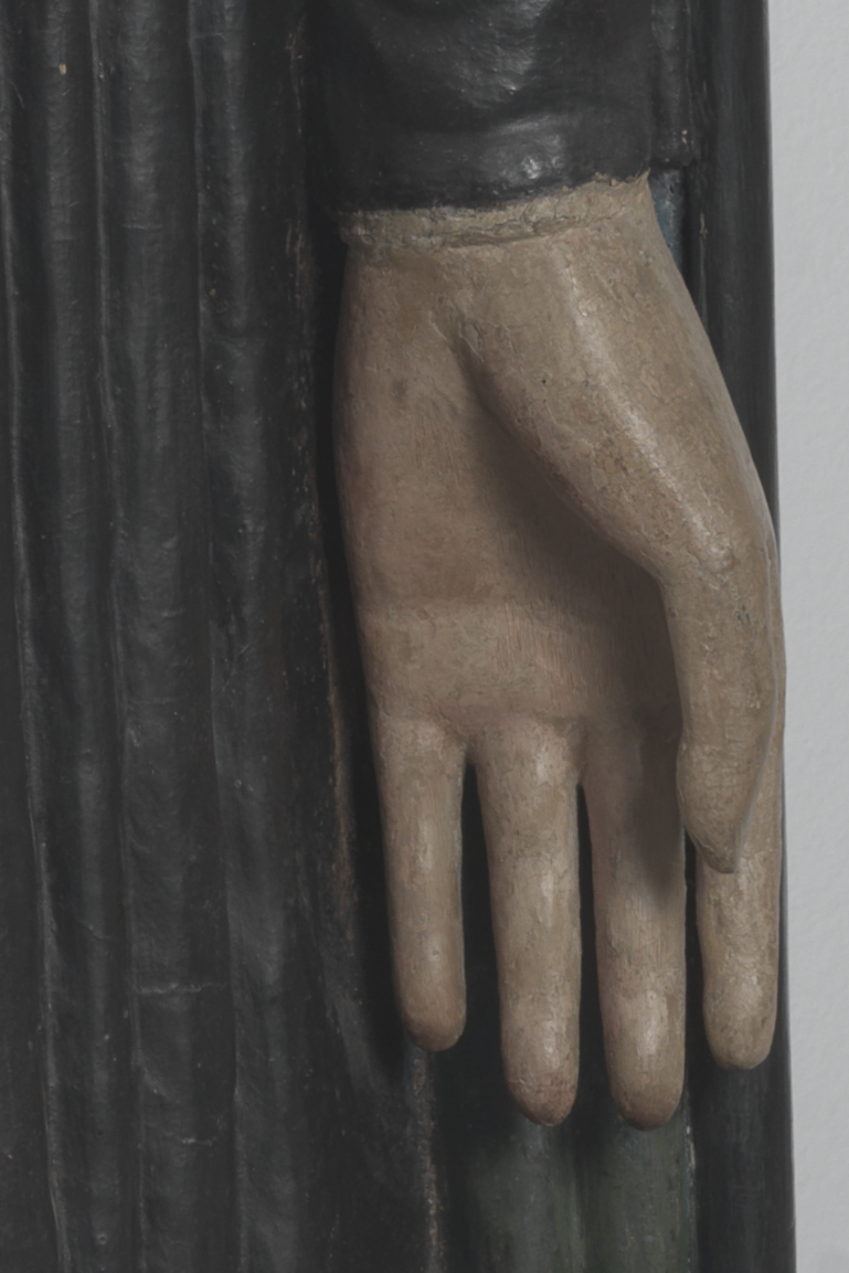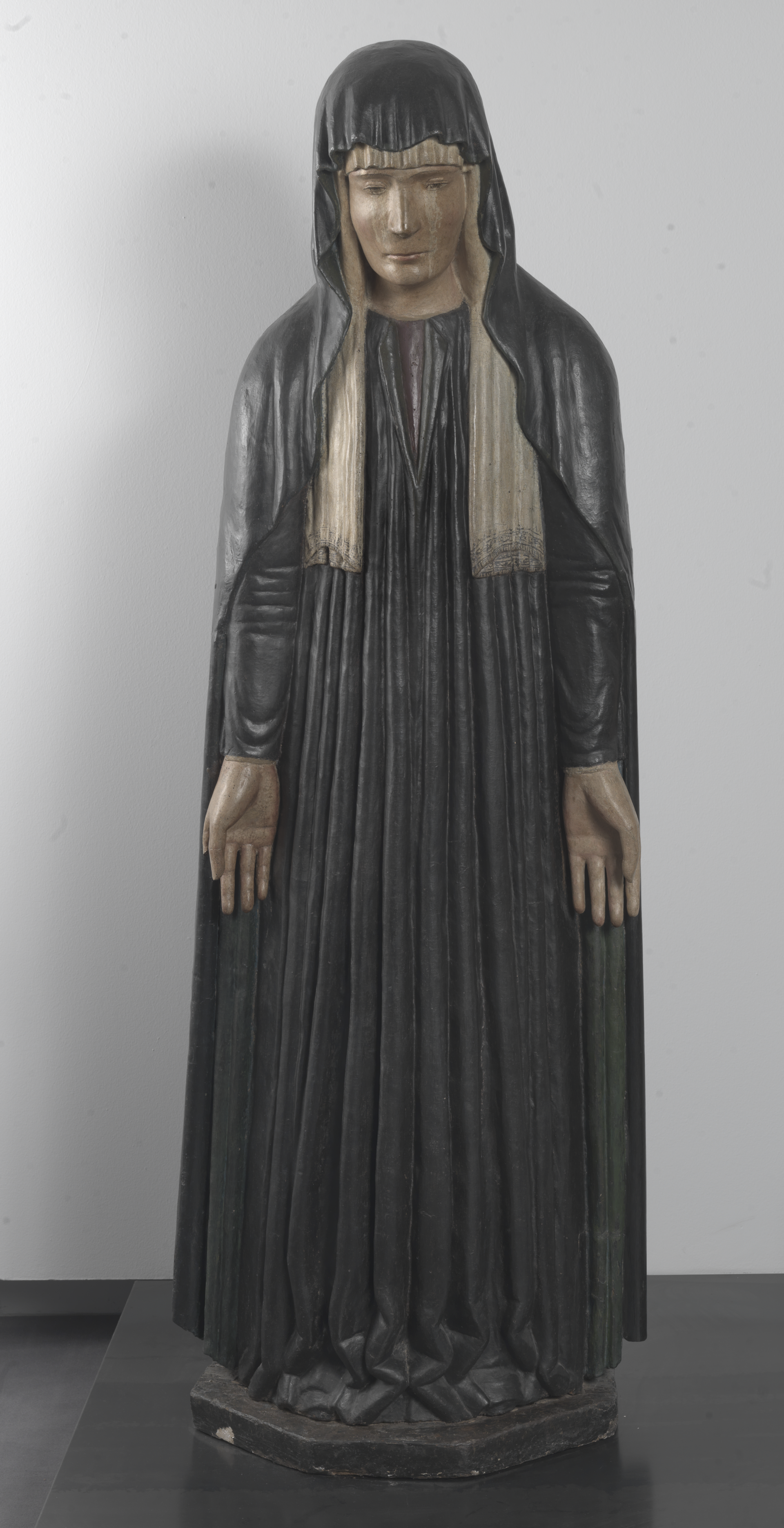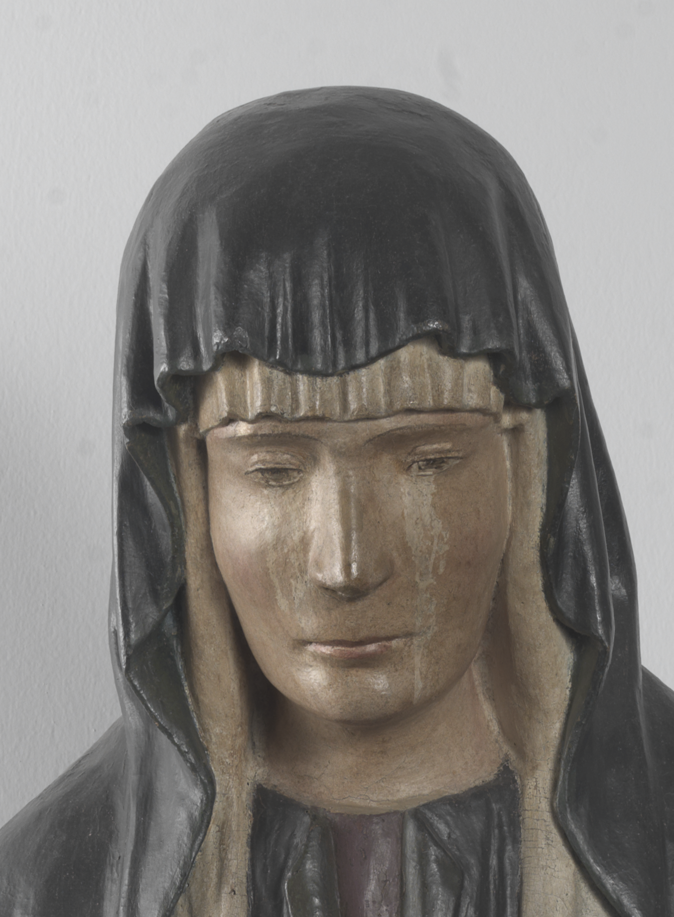 Maria, collocata in basso sul lato sinistro del crocefisso, viene rappresentata nel saio nero delle monache agostiniane con le braccia distese lungo i fianchi e le mani aperte a mostrare le palme. Sul volto segnato da una profonda tristezza sono dipinte le lacrime del pianto per la morte del figlio.