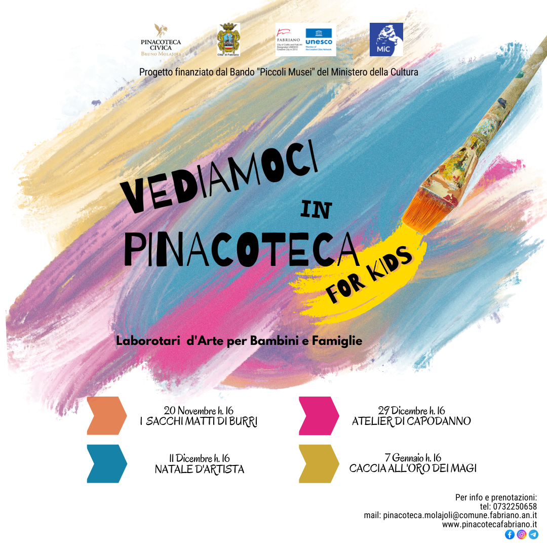 La Pinacoteca Civica è lieta di presentare un ciclo d'incontri tutto dedicato ai più piccoli ed alle loro famiglie. Grazie al bando "Piccoli Musei" del Ministero della Cultura nasce: "VEDIAMOCI IN PINACOTECA for Kids", una serie di laboratori che invitano chi partecipa a provare un coinvolgimento plurisensoriale e pluridisciplinare prestando grande attenzione al “fare” e all’azione, con l’intento di stimolare la sensibilità per l’Arte che ci circonda, le nostre origini e il pensiero progettuale creativo. I laboratori avranno la durata di 1 ora ciascuno da svolgersi in giornate dedicate alle Famiglie al Museo, in modo da creare un luogo il più accogliente ed inclusivo possibile. Avranno come oggetto opere, autori, correnti artistiche e architetture presenti nei Musei Civici della città di Fabriano. Di seguito le date degli incontri: 20 NOVEMBRE H. 16.00 "I SACCHI MATTI DI BURRI"; 11 DICEMBRE H. 16.00 "NATALE D'ARTISTA"; 29 DICEMBRE H. 16.00 "ATELIER DI CAPODANNO"; 7 GENNAIO H. 16.00 "CACCIA ALL'ORO DEI MAGI". Costo del laboratorio: €4 a bambino
