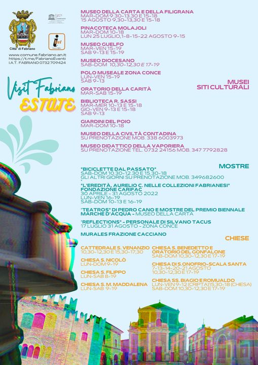 Grazie ad una importante collaborazione tra la Diocesi Fabriano - Matelica ed il Comune di Fabriano alcuni edifici di culto in città, ed anche il Museo Diocesano, rimarranno aperti per il mese di Agosto, con servizio di visita guidata. Implementare la sensibilità religiosa e l'offerta culturale e turistica è uno degli obiettivi che i due enti si prefiggono per questa calda estate. La neo eletta amministrazione comunale è grata alla Diocesi per questa collaborazione, la Diocesi dal canto suo ringrazia i volontari diocesani, l'associazione FaberArtis e i Templari Cattolici d'Italia senza i quali tutto ciò non sarebbe possibile. Gli orari di apertura delle chiese, che hanno aderito al progetto, sono disponibili presso lo IAT di Fabriano in Piazza del Comune (dal martedì alla domenica 9.00/18.00 - 0732.709424). Riteniamo che il territorio fabrianese debba aprirsi e mostrarsi a quanti vengono per conoscerlo ed apprezzarlo. Sono molteplici i punti di interesse che il territorio può offrire non solo alla nostra Comunità ma anche per chi passa di qui per visite giornaliere. Oggi, più che in passato, è necessario avere uno sguardo lungimirante che porti la città verso una dimensione turistica, culturale ed attrattiva per più realtà possibili. Ci auguriamo che, partendo dalle chiese, anche altre realtà culturali e non possano aprirsi a questa nuova prospettiva per una rinascita proficua e duratura della città e del territorio. Nella locandina tutti gli orari e le visite guidate in programma