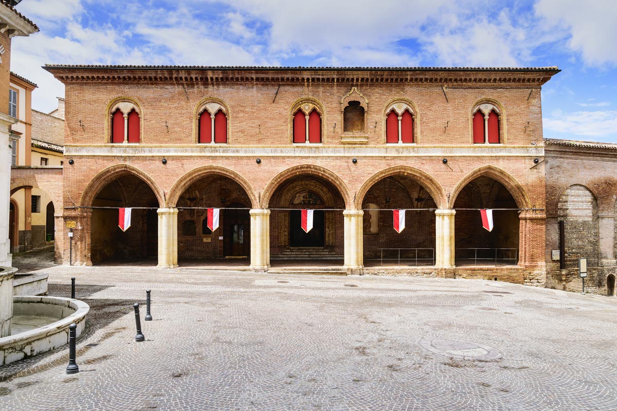 Ristrutturato negli anni Novanta e sede nel 2006 della celebre mostra: "Gentile da Fabriano e l'altro Rinascimento", l'edificio che ospita oggi la collezione, venne costruito, a partire dal 1456, per riunirvi le strutture ospedaliere presenti in città e fu in seguito utilizzato come brefotrofio femminile e poi come istituto psicopedagogico. Risalgono al 2007 la piena riapertura al pubblico e il globale riallestimento delle opere. La struttura è una delle più pregevoli testimonianze di architettura tardogotica nelle Marche: la facciata originaria è caratterizzata da un portico voltato a crociera, con cinque arcate a sesto acuto di diversa ampiezza, che poggiano su pilastri cruciformi, mentre nella parte superiore si aprono finestre bifore ad archetti trilobati, inscritte entro un arco a tutto sesto. L'adiacente Chiesa di Santa Maria del Buon Gesù, facente parte del complesso monumentale che ospita la Pinacoteca, conserva lo stendardo, dipinto intorno al 1456 dal Maestro di Staffolo, raffigurante la Madonna in adorazione del Bambino. Allo stesso pittore appartengono gli affreschi visibili sotto il portico. All'interno la chiesa conserva affreschi del fiorentino Andrea Boscoli, realizzati agli inizi del XVII secolo. Nel chiostro si trova il pozzo a pianta ottagonale del 1483.
